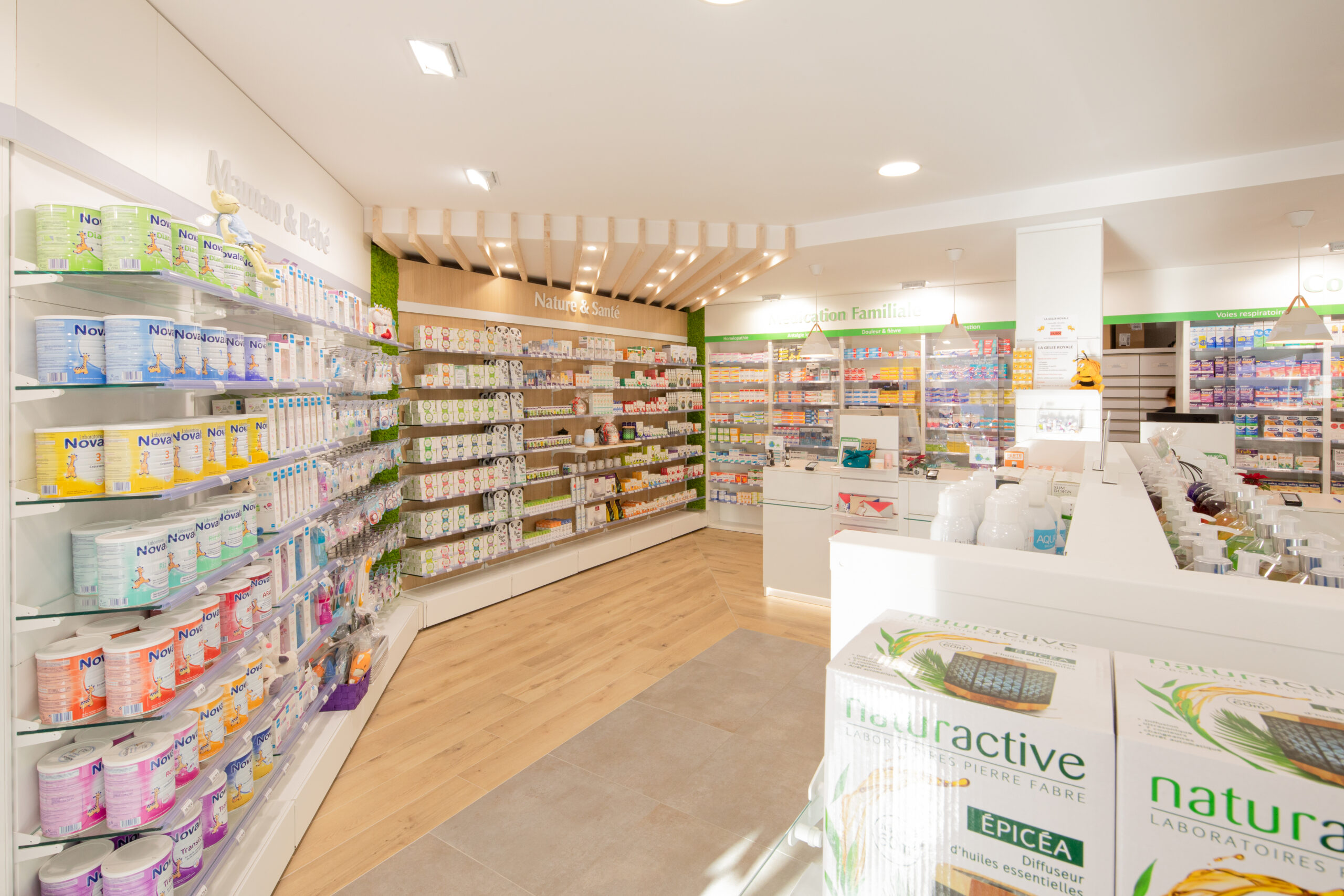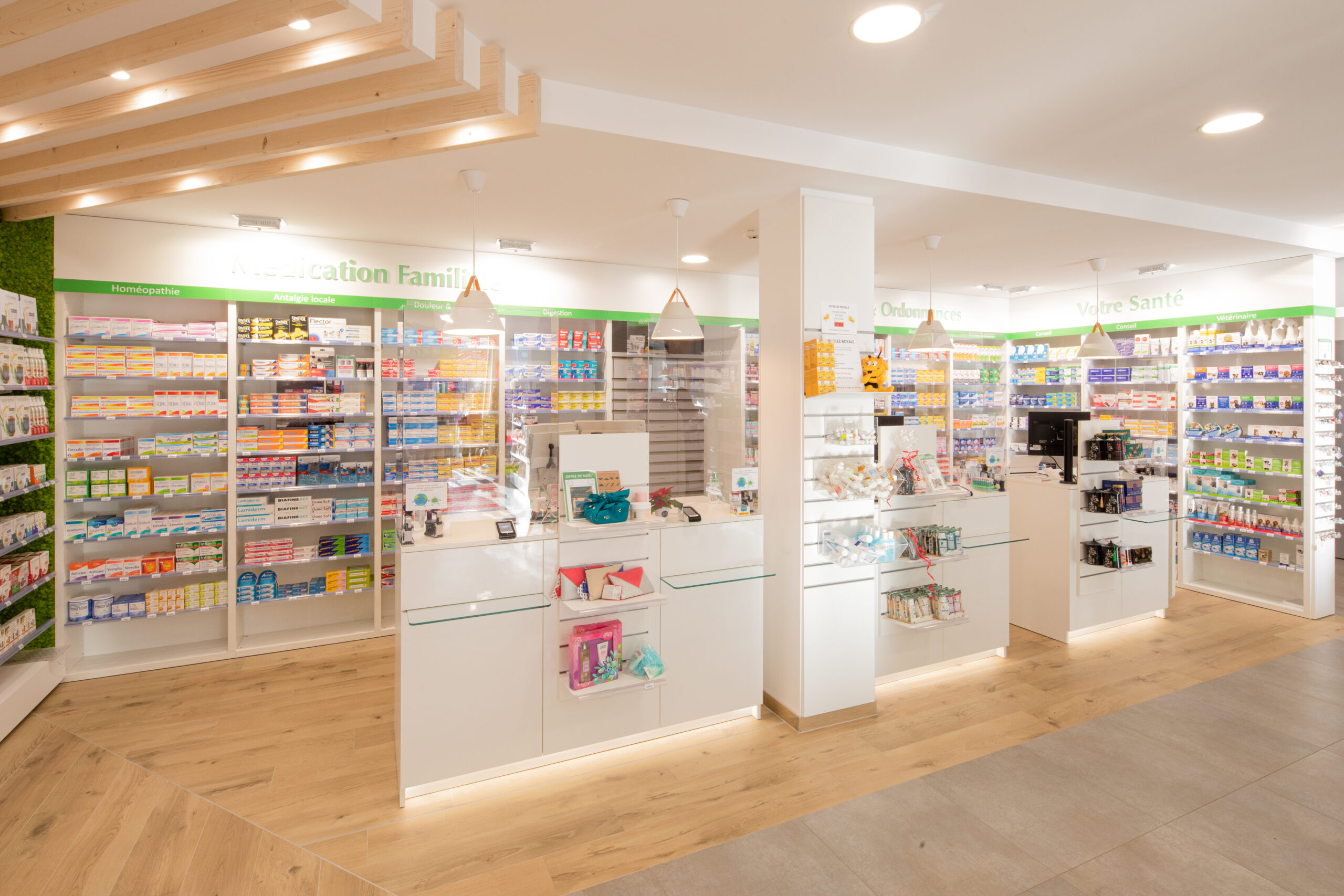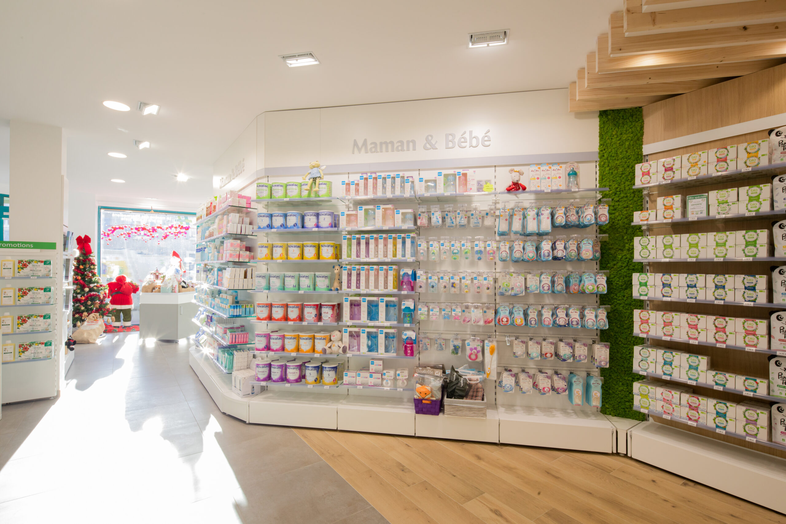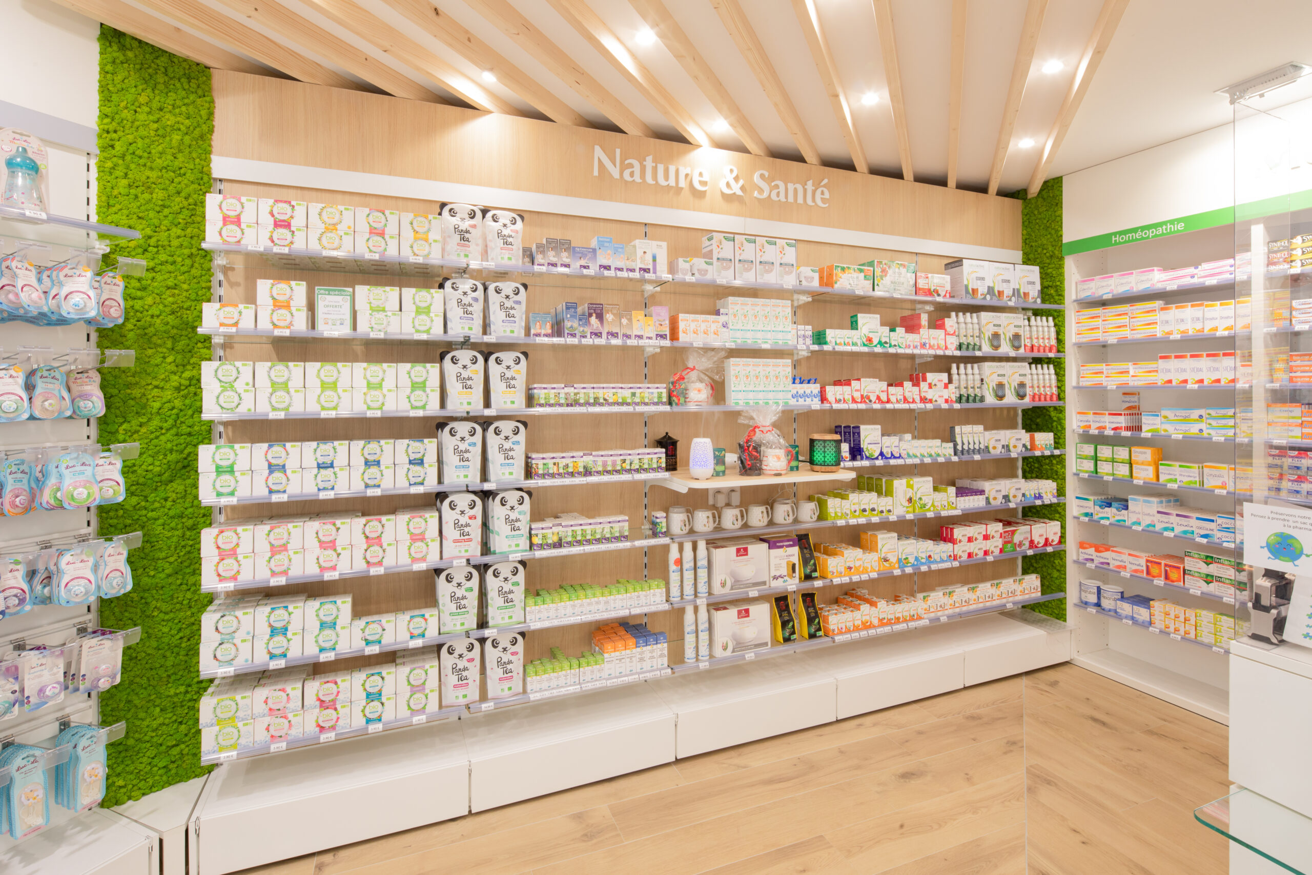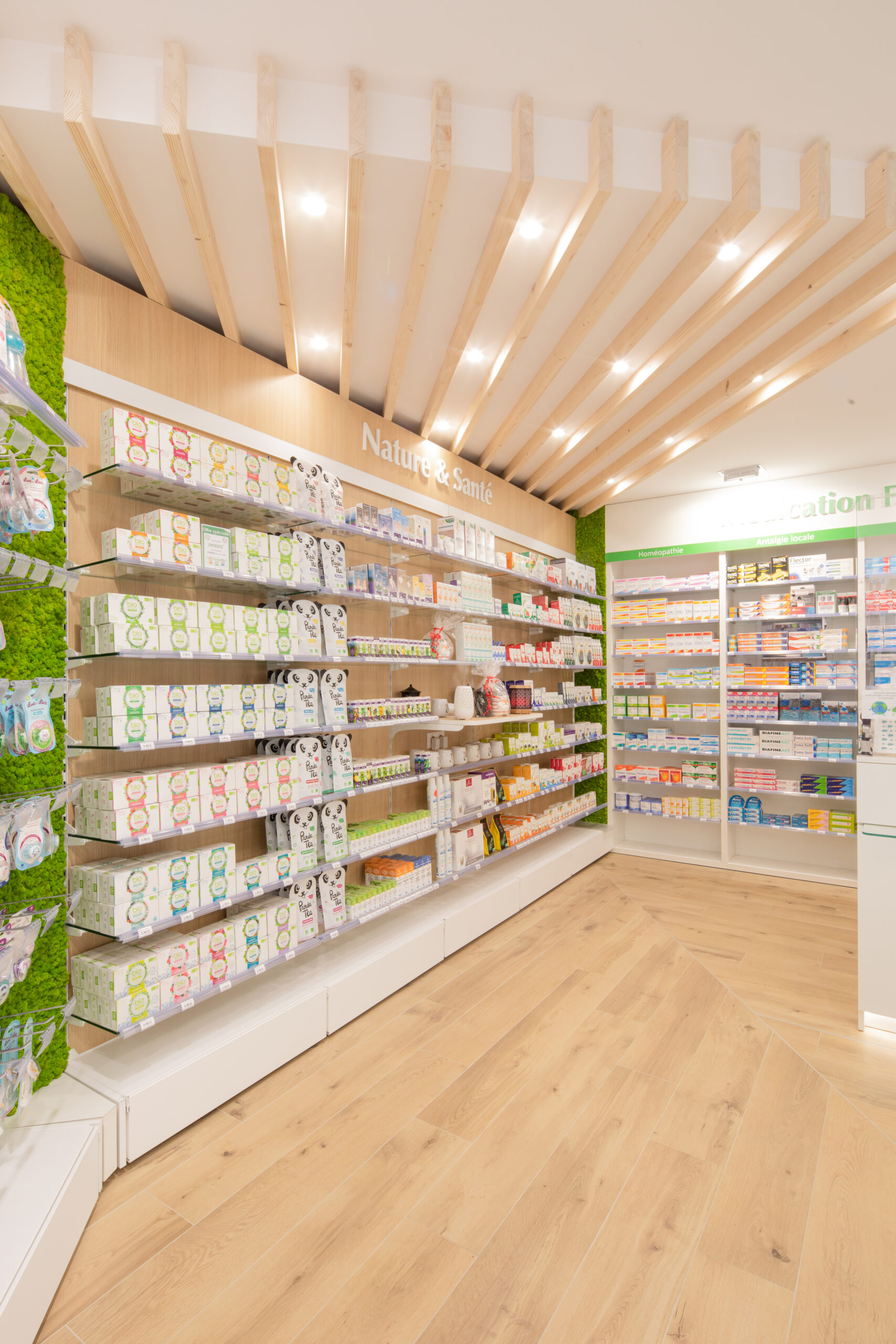 La farmacia Du Village è un angolo incantevole dove la natura si fonde con il benessere. Un’atmosfera calda e avvolgente, grazie all’uso sapiente del legno che riveste pareti e soffitti. I listelli di legno che si estendono verso l’alto creano un senso di continuità e apertura, amplificando la luminosità dello spazio. Il muschio, delicatamente integrato nelle pareti, aggiunge tocchi di verde vibrante, evocando la freschezza di un bosco. Questo richiamo alla natura non è solo visivo: si respira un’aria di tranquillità e serenità, che invita a soffermarsi e a esplorare. Gli scaffali, ben organizzati, espongono prodotti naturali e rimedi, rendendo ogni visita un’esperienza sensoriale, in cui il contatto con la natura è palpabile.